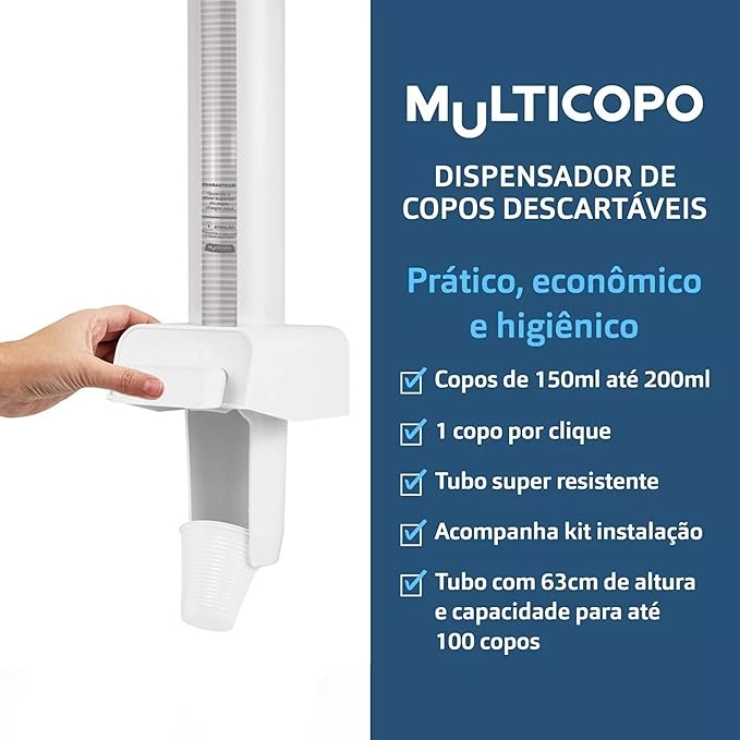 O porta copo é compatível com copos descartáveis de 150ml e 200ml. Ele é fácil de instalar e pode ser fixado em paredes ou balcões.